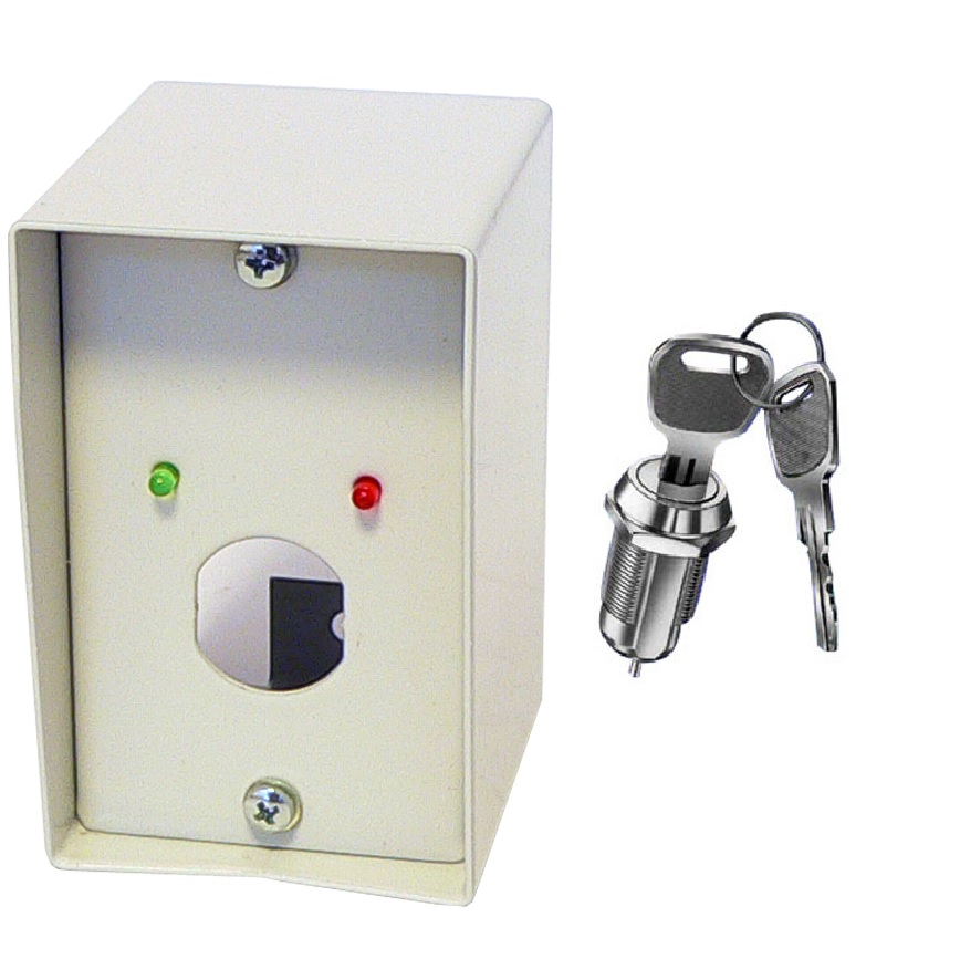 • szabotázsvédett KKDSZ kulcsos kapcsoló doboz, kétállású kulccsal, zöld és piros LED jelzés, vagyonvédelmi rendszerekhez
