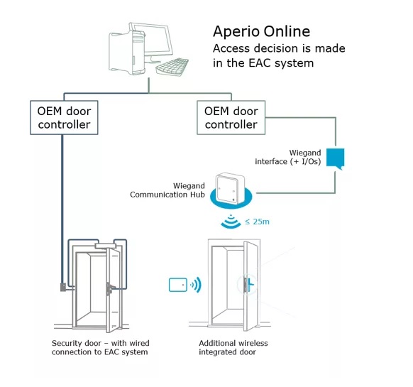 Aperio AH20 HUB támogatja az C100, E100 és L100 eszközök vezeték nélküli kommunikációját Wiegand interfészen keresztül csatlakozik a beléptető rendszerhez.