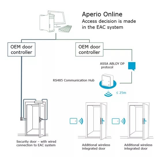 A beléptető rendszerrel összekötve RS485 buszon keresztül, támogatja az Aperio C100, E100 és L100 eszközök vezeték nélküli kommunikációját a beléptetővel.