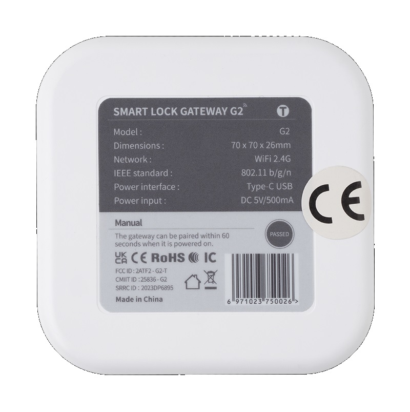 A G2-TT egy Wi-Fi átjáró, aminek a segítségével a TTLock kompatibilis eszközök amik bluetooth-on keresztül kommunikálnak, távolról is elérhetők. Az eszközre tápfeszültséget adva könnyedén összepárosítható a TTLock applikációval.
