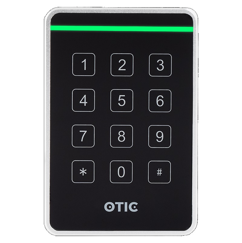 Az OTIC-210-K-M egy OTIC logóval ellátott tasztatúrás Wiegand segédolvasó esztétikus alumínium kerettel, és műanyag előlappal, amely 13,56 MHz MIFARE kártyák olvasására képes, és 26, illetve 34 biten kommunikál. LED-es visszajelzéssel és csipogóval rendelkezik.