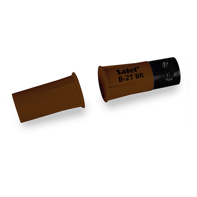 B-2T BR hermetikus kontakton frontérzékelő ajtó- vagy ablakkeretbe ill. -szárnyba való szereléshez, csavarcsipeszekkel ellátva. Beszerelés módjának köszönhetően kész állapotban kívülről nem látható. Az érzékelő kapható fehér és barna változatban.