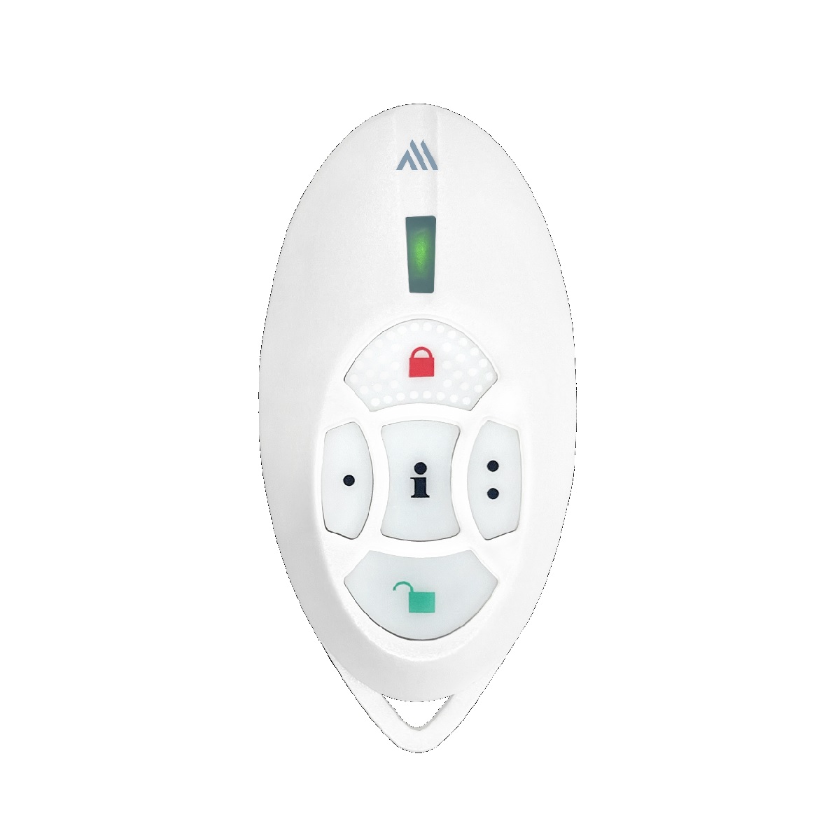 A REM2M távirányító elegáns és tartós kialakításának köszönhetően a felhasználók egyetlen gombnyomással élesíthetik, hatástalaníthatják és kezelhetik a programozható kimeneteket (PGM).